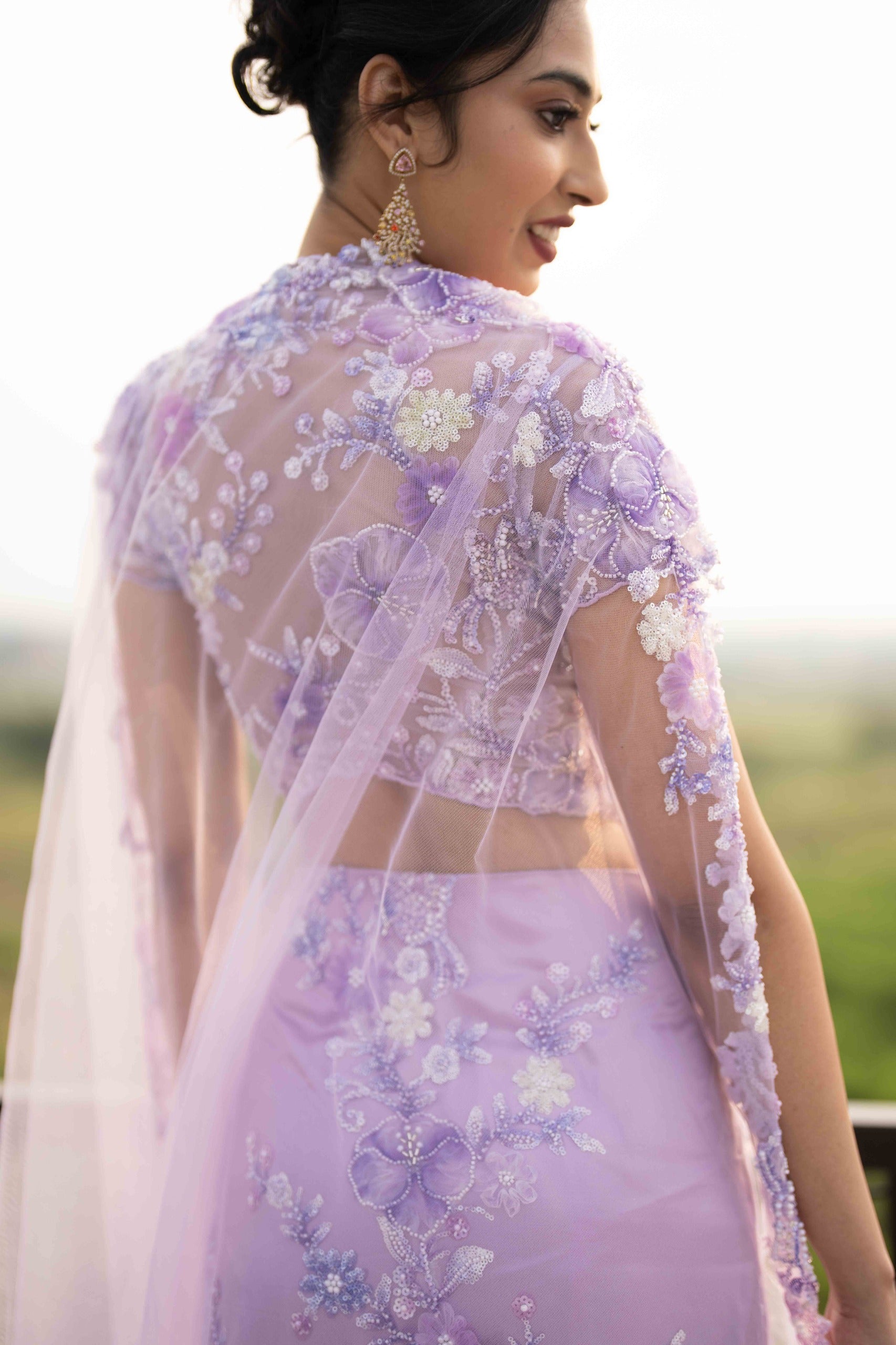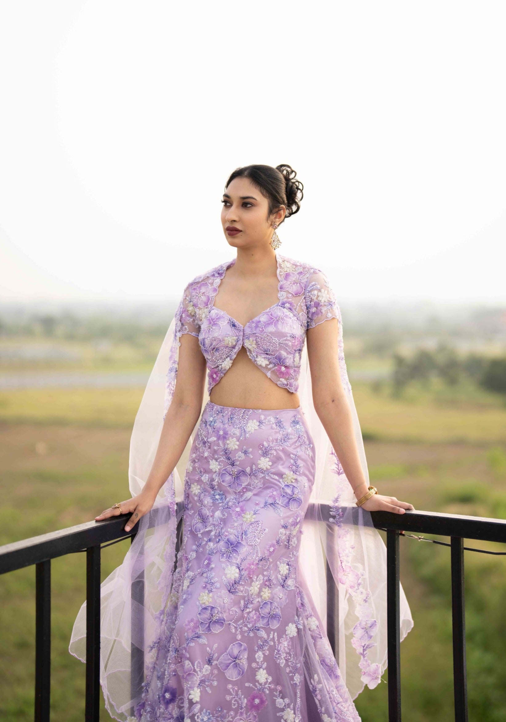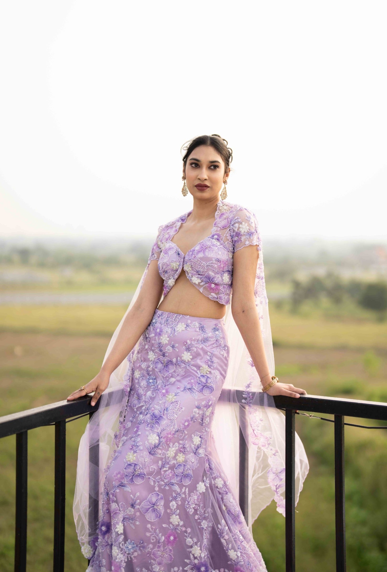 The ensemble is a fitted Mermaid-style lehenga crafted with hand embroidered floral appliqués, sequins and pearls.