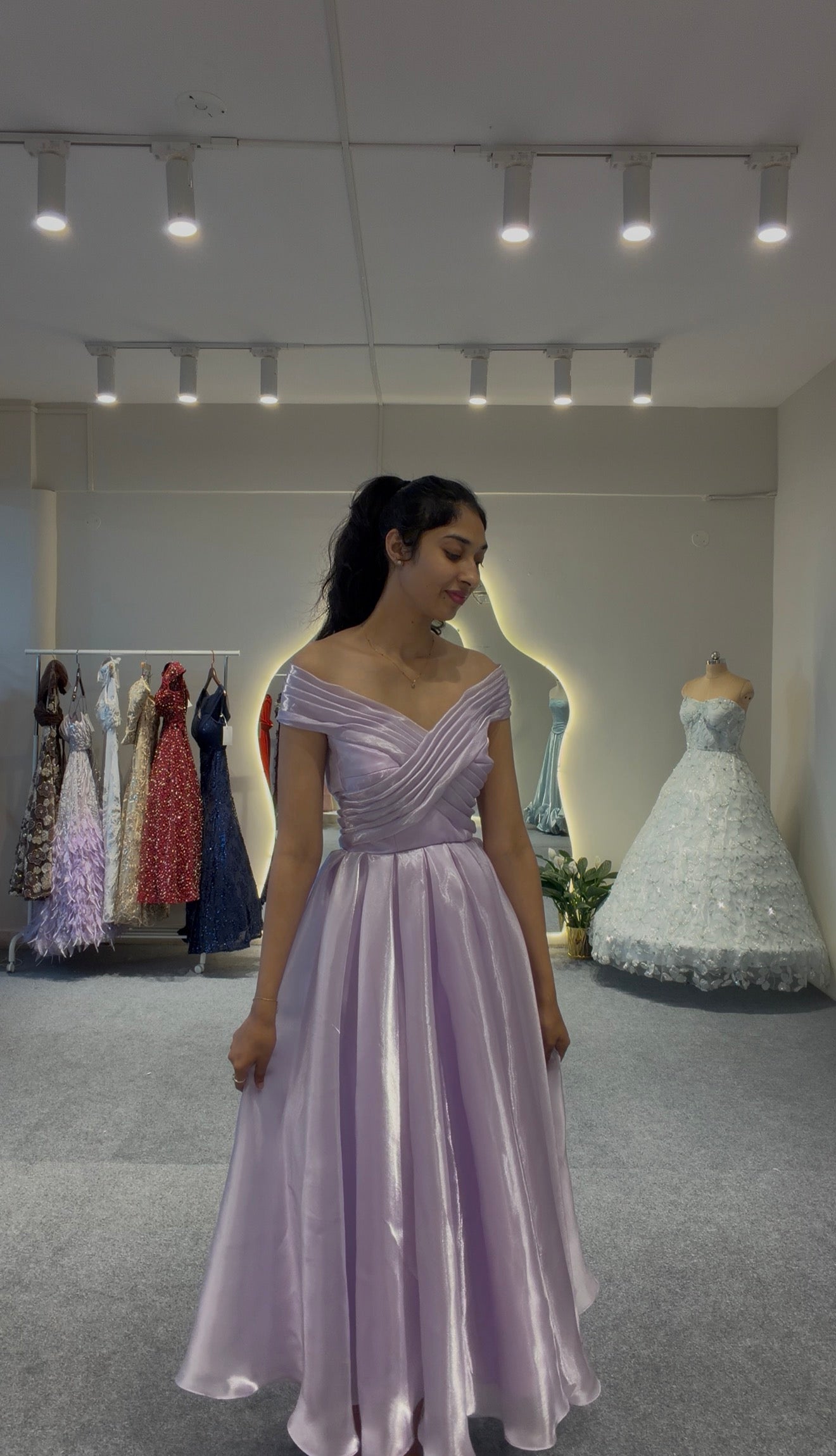 Refined off-shoulder evening gown in a pastel lilac tone, designed with soft sculptural pleats that wrap diagonally across the bodice while the fitted waist flows into a smooth, voluminous A-line skirt.