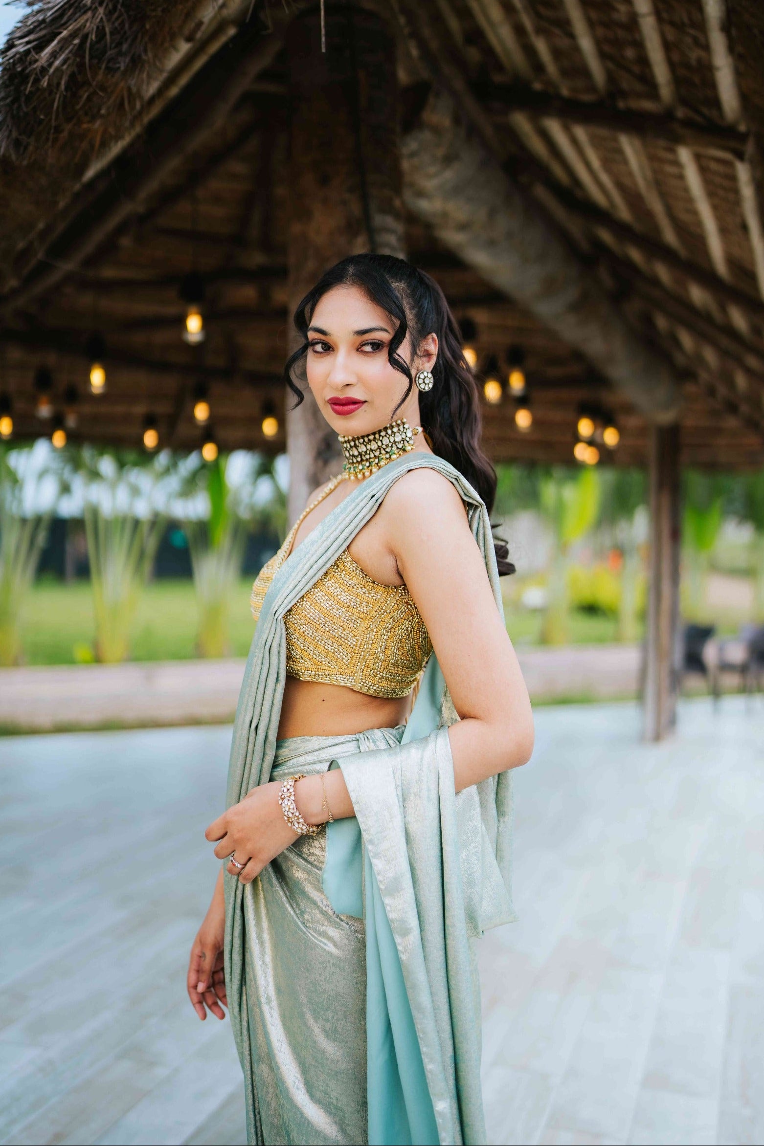 The ensemble is a draped structured skirt with a saree style draping pattern and a heavily beaded blouse golden blouse.